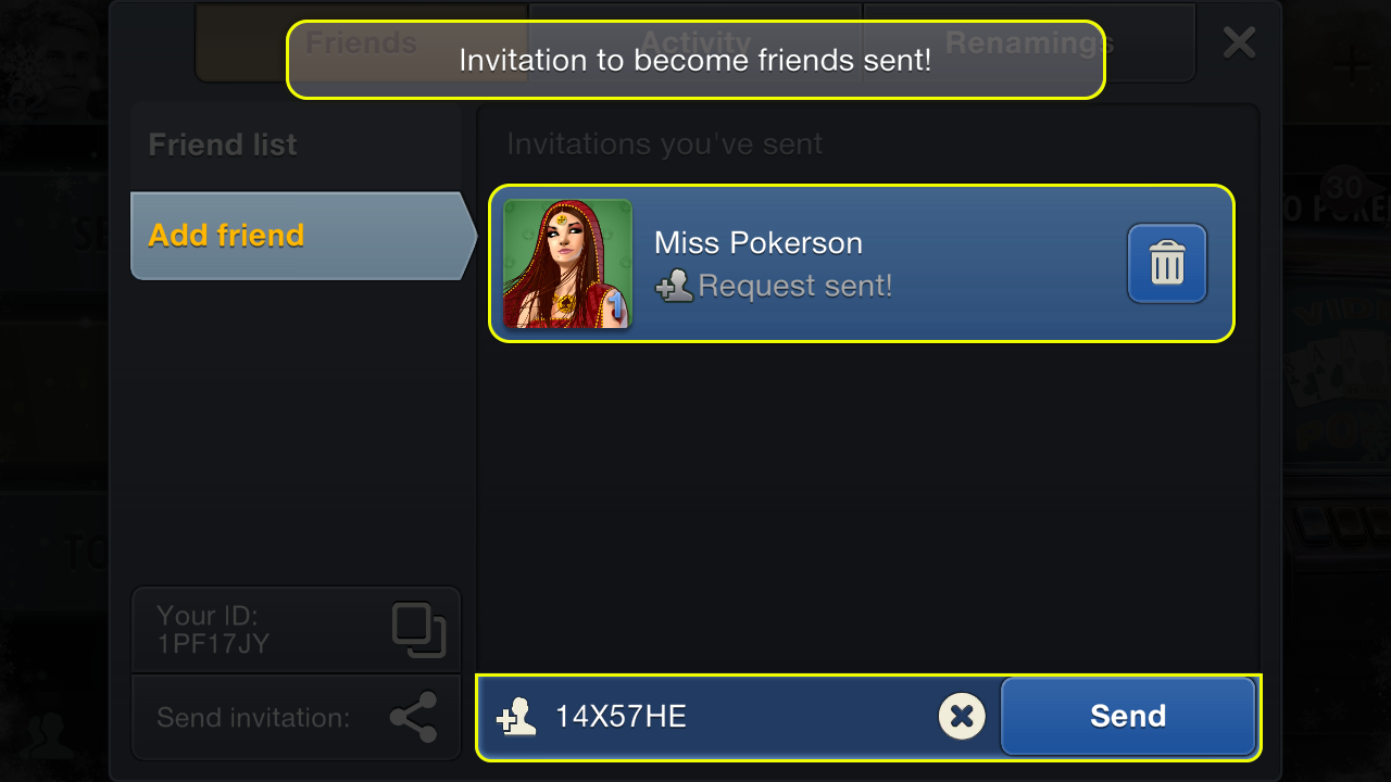 Use the received identifier to send a friend request. In the same "Friends" section, tap "Add Friend". Enter the player's ID in the input field at the bottom of the screen. Tap the "Send" button.