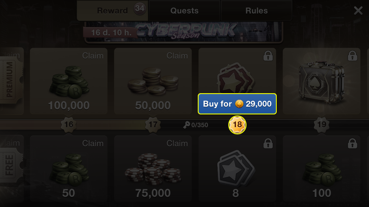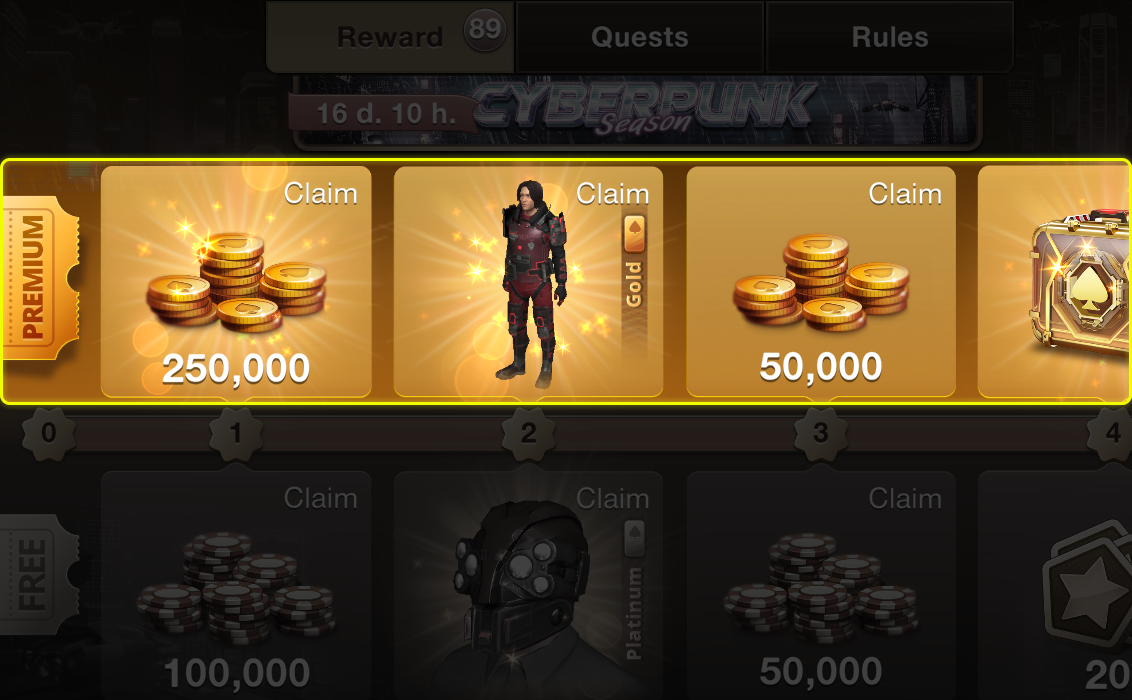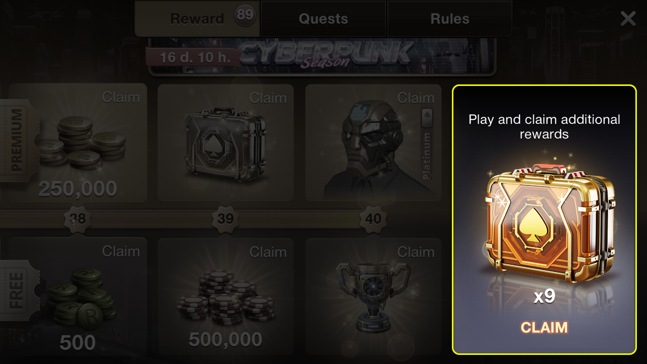 Even after reaching level 40, you can continue to complete quests. For this, you will receive season points, which allow you to accumulate additional rewards โ pokerboxes. Premium pass allows you to claim all the accumulated items.