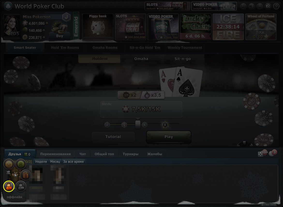 Facebook, Mail.ru, OK, and VK accounts automatically sync your friends list. If your friends have World Poker Club profiles, they are added as friends in the app automatically. Such friends cannot be removed through the app — you must delete them directly in the corresponding social network.