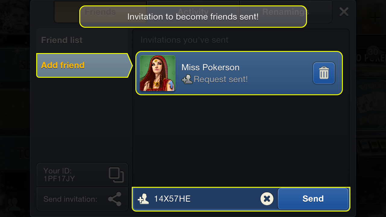 Use a player's ID to send them a direct friend request. In the same Friends section, go to the "Add Friend" tab. Enter the other player's ID in the input field at the bottom of the screen. Tap the "Send" button.