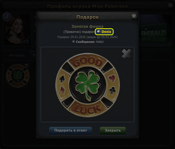 Если вы получили не анонимный подарок от другого игрока, вы можете открыть его профиль, чтобы отправить подарок в ответ, добавить в друзья или выразить уважение. Для этого в отправленном подарке нажмите на кнопку открытия профиля.