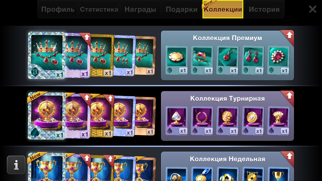 Коллекции — это специальные наборы карточек, которые игроки могут собирать, играя за столами, в мини-играх и участвуя в турнирах. Каждая коллекция имеет свои уникальные условия получения карточек и способы их улучшения.