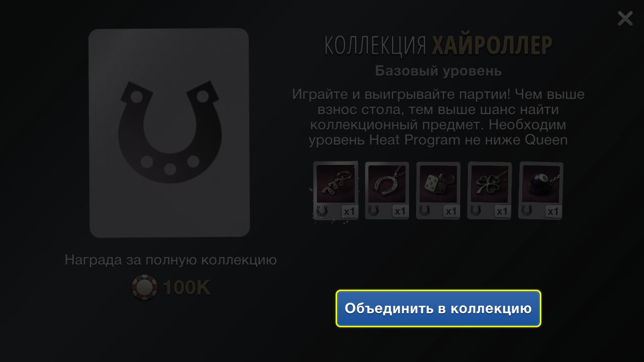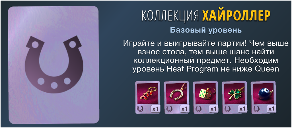 Карточки коллекции Хайроллер добываются за дорогими столами. Чем выше взнос стола, тем выше шанс получения карточки. Сбор карточек коллекции доступен только на аккаунтах с лигой Queen и выше.