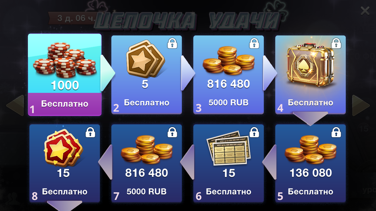 - Цепочка состоит из платных и бесплатных ячеек и может включать игровую валюту, покербоксы, билеты и жетоны для мини-игр.